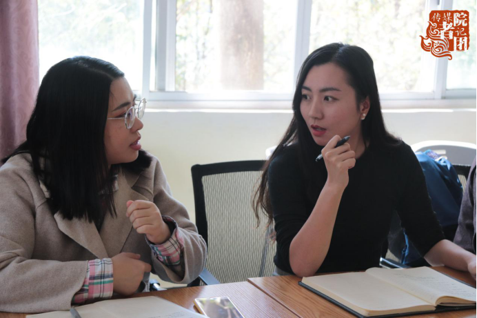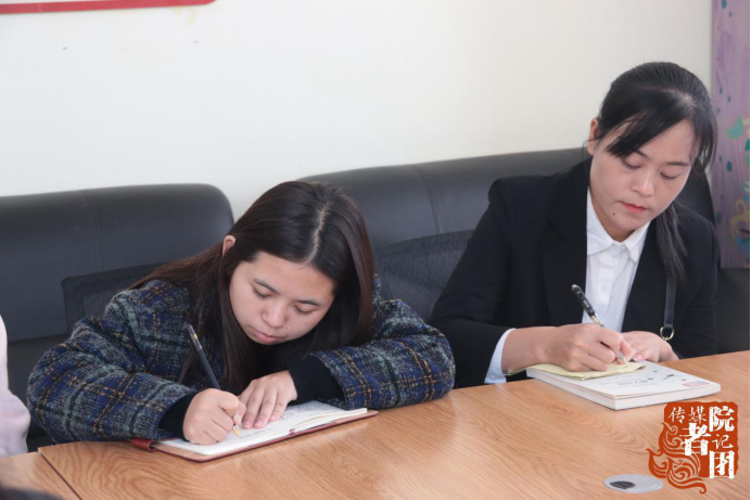 传媒学院副院长胡又嘉与教师陈姮讨论具体工作