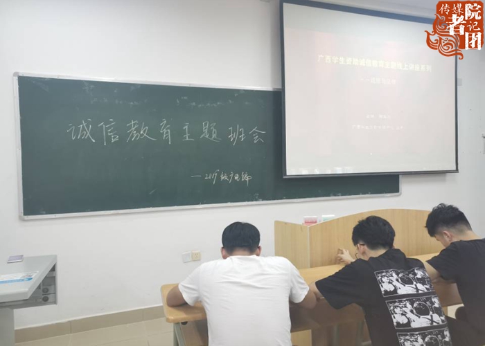 近年来,大学生失信问题越来越引起人们的关注,大学生存在考试作弊、不按时归还助学贷款等案例时有发生。为了切实加强大学生的诚信教育,让学生们明白失信带来的危害,传媒学院辅导员组织学生利用周日例会的时间观看由广西大学生资助中心录制的《诚信与法律》线上主题讲座。