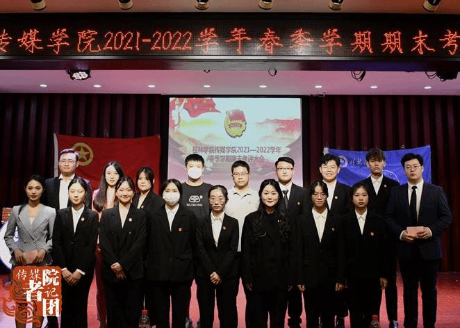 大会伊始,全体起立奏唱共青团团歌,主持人介绍到场嘉宾并宣读本次考评大会流程。本次考评大会共有来自传媒学院2019级、2020级、2021级的11个团支部参加。各个团支部按抽签次序依次上台围绕“思想建设、组织建设、学风建设、公益实践”四个方面进行总结性展示及答辩。展示过程中,各团支部表现良好,将专业特色与展示内容相结合。其中2021级播音与主持艺术团支部在展示中展示了该团支部制作的贴有“思想建设、组织建设、学风建设、公益实践”四个方面照片的麦克风,并进行了弹唱表演《夜空中最亮的星》。最后,经过一番激烈的角逐,2020级广播电视编导团支部、2019级播音与主持艺术团支部、2021级播音与主持艺术团支部分别获得本次期末考评大会的前三名。