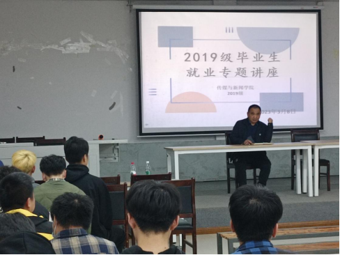 3月8日晚19:00,传媒与新闻学院于嘉善楼132教室开展了2019级毕业生就业专题讲座,旨在为传媒与新闻学院毕业生提振就业信心,提供就业帮助。此次讲座邀请了教育与音乐学院党总支书记周杰教授与传媒与我们学院党总支书记孙俊副教授,同时,现场还为同学们关于就业问题做出相应指导,传媒与新闻学院辅导员王佳雨担任会议主持人。传媒与新闻学院2019级新闻学专业、2019级数字出版专业、2019级播音与主持艺术专业以及2019级广播电视编导专业150余名学生参加本次讲座。