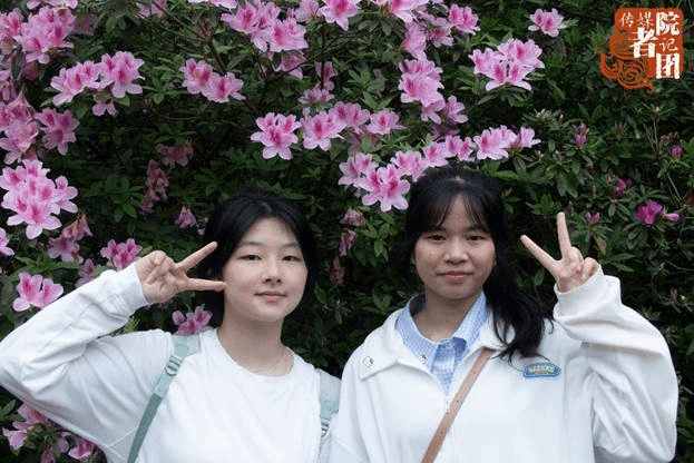 记者团成员颜嫦秋、余洪丽在杜鹃花前合影