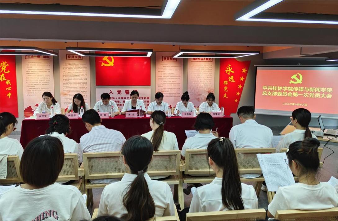 大会在庄严的国歌声中拉开序幕。翟彦书记代表上一届中共桂林学院传媒与新闻学院总支部委员会向大会作题为《全面贯彻落实党的二十大精神 以高质量党建引领学院工作守正创新》的工作报告。大会的主题是:以习近平新时代中国特色社会主义思想和党的二十大精神为指导,贯彻党的教育方针,落实立德树人根本任务,深刻把握“两个结合”的重大意义,推进党建与业务深度融合,打造“党旗领航·光影铸魂”品牌,学思想、强党性、重实践、建新功,以高质量党建引领学院事业高质量发展,为“做大做强”桂林学院而团结奋斗!