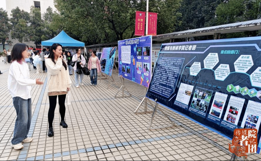 传媒与新闻学院副院长胡又嘉参观活动现场的展板设置