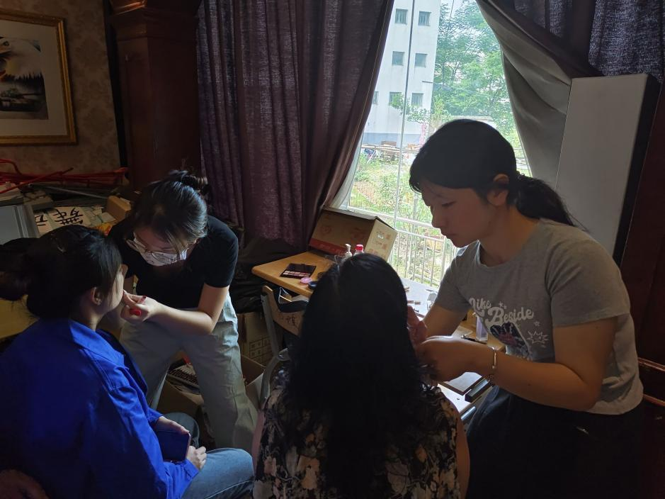 活动开展期间,传媒与新闻学院学生社区党支部的志愿者队伍分工明确,宣传组负责制作宣传海报、横幅,在活动前期就通过多个平台进行宣传工作,大大提升了活动的知名度和影响力;后勤组负责活动现场的布置、器材管理和设备的调试等工作,全力配合拍摄组的志愿者,确保活动的顺利进行;妆造组的成员们负责为报名参加活动的人员设计妆容,让他们在镜头前展现出自己最美的精神风貌;拍摄组则根据被拍摄者的形象特点,引导他们作出合适的表情、摆资等、同时关注拍摄构图和成片后期,力求带给被拍摄者一场体验良好的专属形象拍摄。大家职责分明、各司其职,在大家的共同努力下,活动现场井井有条。
