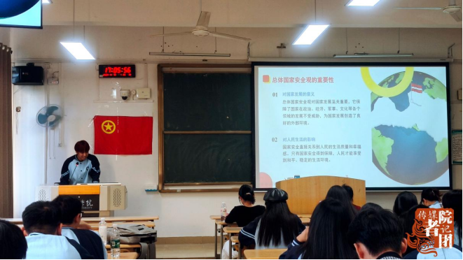 活动伊始,主讲人黄源飞带领全体成员起立奏唱《国际歌》。随后黄源飞同学深入浅出地讲述国家安全观的定义、核心要素、重要性和涵盖的各个领域。从家庭安全、社会安全、国家安全到国家安全未来发展,为同学们详细解读了国家安全的丰富内涵。接下来黄源飞同学通过案例讲解,让同学们深刻认识到国家安全与每个人息息相关,使原本晦涩的理论知识变得通俗易懂。同学们认真地聆听着,不时地在本子上写下笔记。