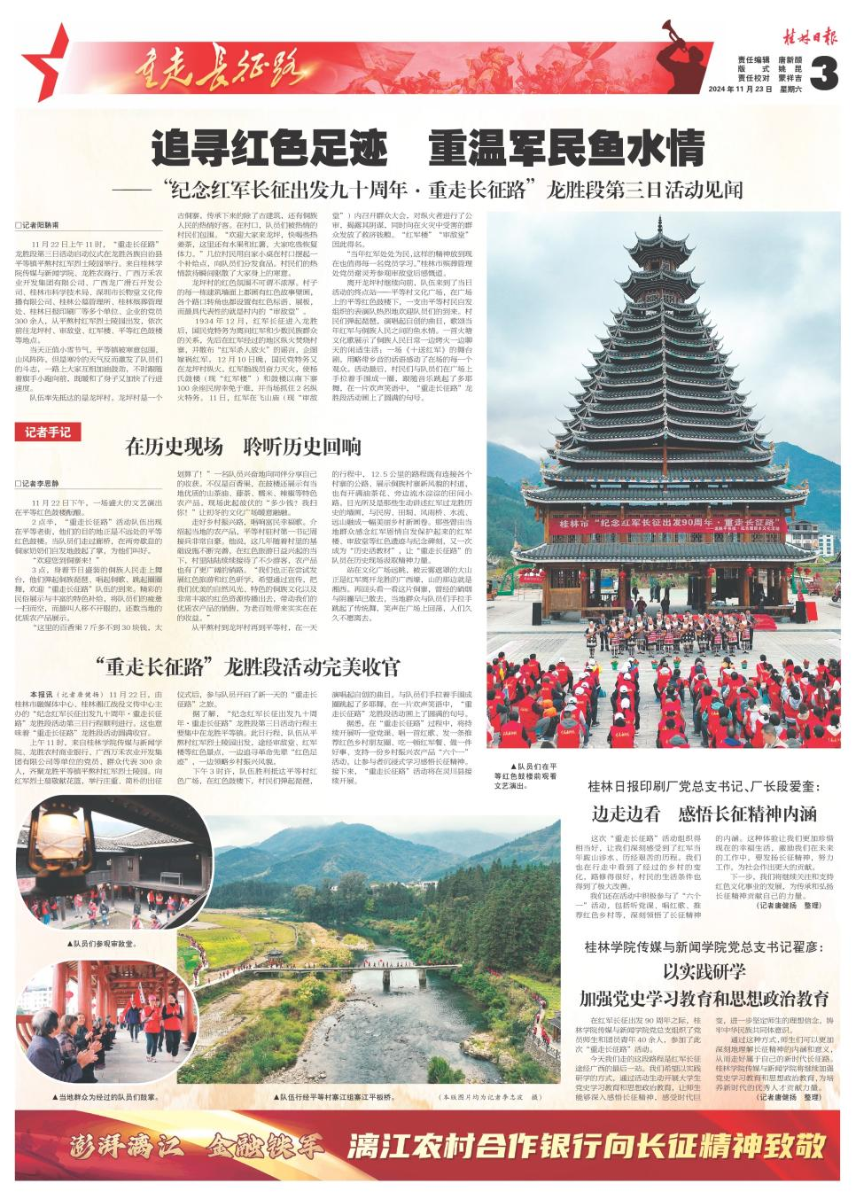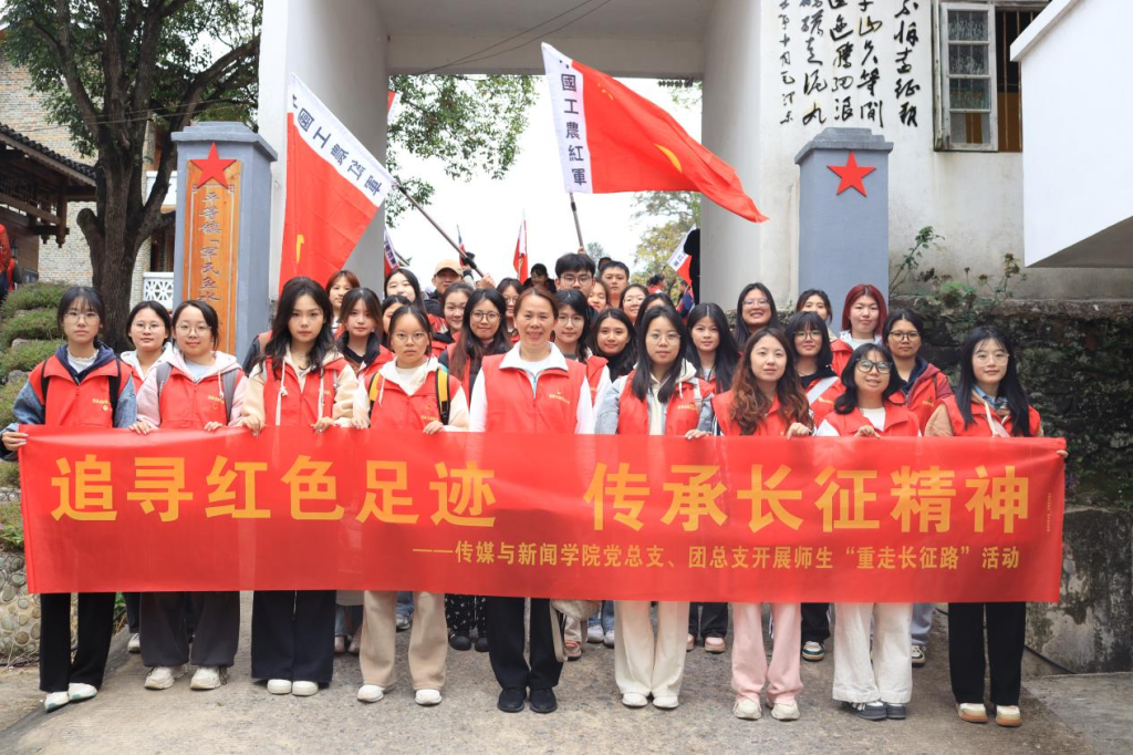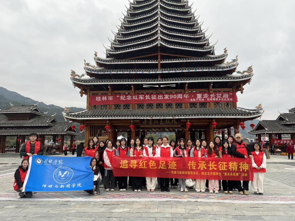 今年是红军长征出发90周年,为弘扬长征精神,赓续红色血脉,11月22日,传媒与新闻学院党总支组织党员师生、团学青年约40人赴桂林市龙胜各族自治县平等镇开展主题为“追寻红色足迹 传承长征精神”的“重走长征路”主题活动,以实践研学方式生动开展大学生党史学习教育和思想政治教育。此次活动得到桂林日报、桂林晚报、桂林电视台《焦点桂林》、龙胜融媒体中心等多家媒体关注报道。
