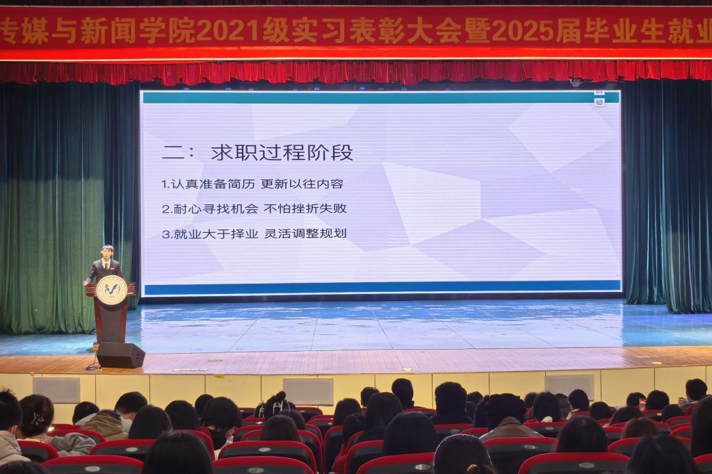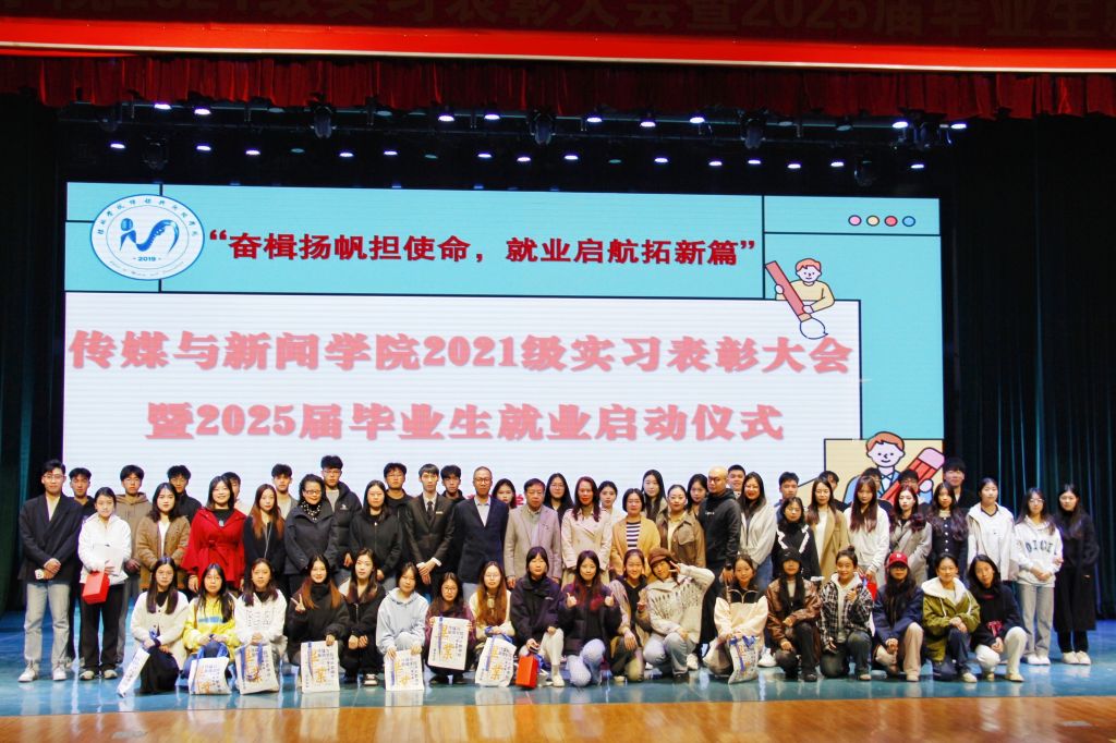 11月25日上午,传媒与新闻学院在弘善讲堂开展了以“奋楫扬帆担使命,就业起航拓新篇”为主题的2021级实习表彰大会暨2025届毕业生就业创业启动仪式。传媒与新闻学院领导班子、学生事务(处)部副处长、学院全体教职工以及2021级全体学生参加本次大会。