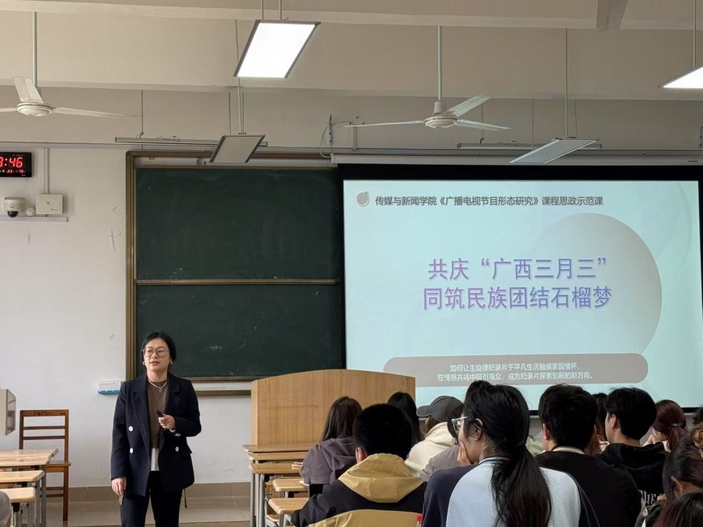 本次公开课是由广播电视编导专业负责人陈璐副教授主讲,讲授的内容是“少数民族纪录片创新的新方法”。结合专业特色,将广西民族文化挖掘、影像讲好广西故事,与传播民族文化技能融合在教学过程中。聚焦关键步骤,提炼课程重点思政元素,一是新征程上铸牢中华民族共同体意识的培养,二是新时期传媒人需要具备的正气、底气、锐气。整个讲课教学过程精彩纷呈,课堂气氛诙谐而活跃。