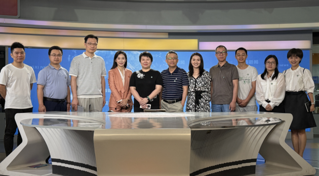 在广西广播电视台,考察团一行在新闻中心副主任马吉骏的陪同下,听取了广西广播电视台发展历程的情况介绍,实地参观了全媒体电视新闻演播室。