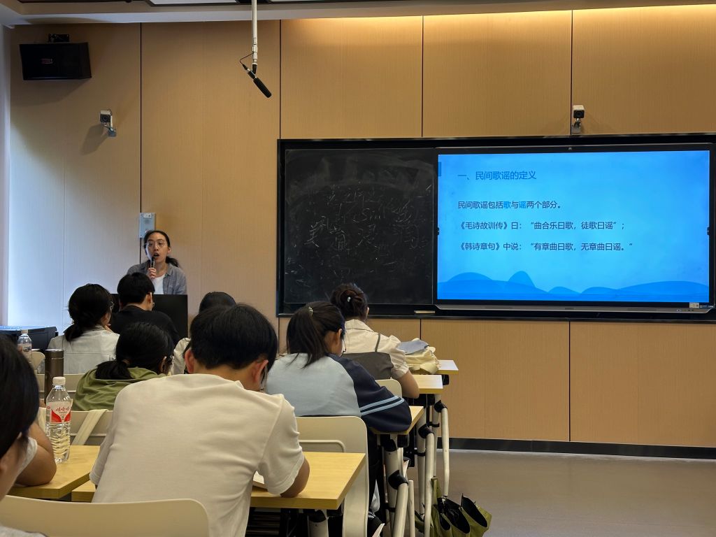 课堂以“民间歌谣的文化意蕴与艺术特征”为主线展开,整体课堂氛围积极活跃。授课教师通过图文并茂的课件,结合大量民间歌谣实例,系统梳理了劳动歌、仪式歌、时政歌等不同类型民歌的文化内涵与艺术特征。