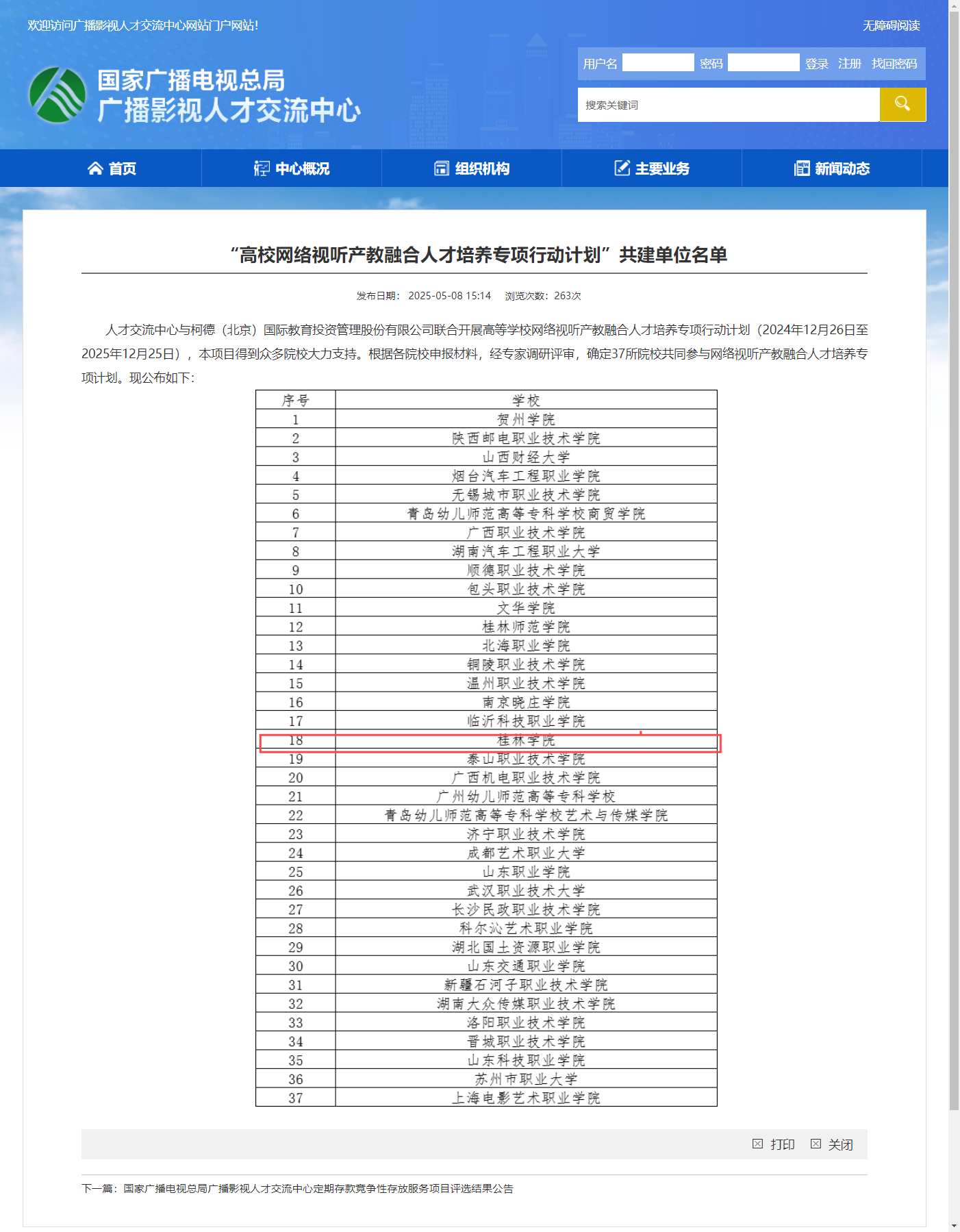 5月8日,国家广播电视总局影视人才交流中心公布了“高校网络视听产教融合人才培养专项行动计划”共建单位名单,我校成功入选。