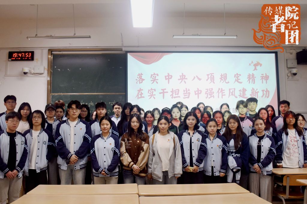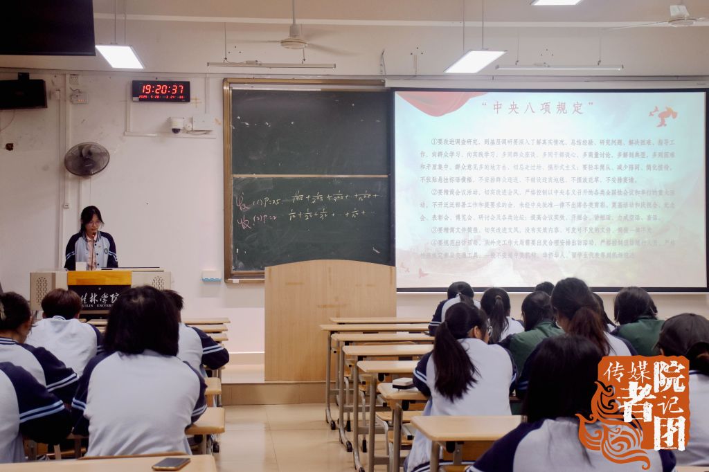 大会伊始,由毕颖欣主持发言,阐释中央八项规定核心内容,包括要改进调查研究,要精简会议活动,要精简文件简报,要规范出访活动,要改进警卫工作,要改进新闻报道,要严格文稿发表,要厉行勤俭节约几项内容。随后通过《八项规定改变中国》视频及三大会议案例深化学习。紧接着,党员李阳分享入党心路,强调党课对党性的提升;预备党员姚媛珍以校青协经历诠释"为人民服务",用实际行动践行党员责任。同时,预备党员李珊珊反思理论联系实际的不足,立志夯实专业服务社会;以及预备党员农秀英通过党史学习感悟党的初心,决心将个人理想融入国家发展,让青春在奉献中绽放光彩。