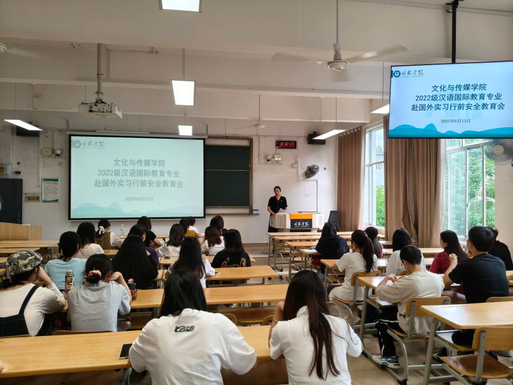 为保障学生国外实习工作顺利开展,增强学生的安全防范意识和跨文化适应能力,6月13日上午,文化与传媒学院在1210教室召开了2022级汉语国际教育专业赴国外实习行前安全教育会。学校副校长、文化与传媒学院党总支书记、国际交流与合作处老师、国外实习点实习指导老师、辅导员及37名即将赴泰国、越南实习的学生参加了会议。