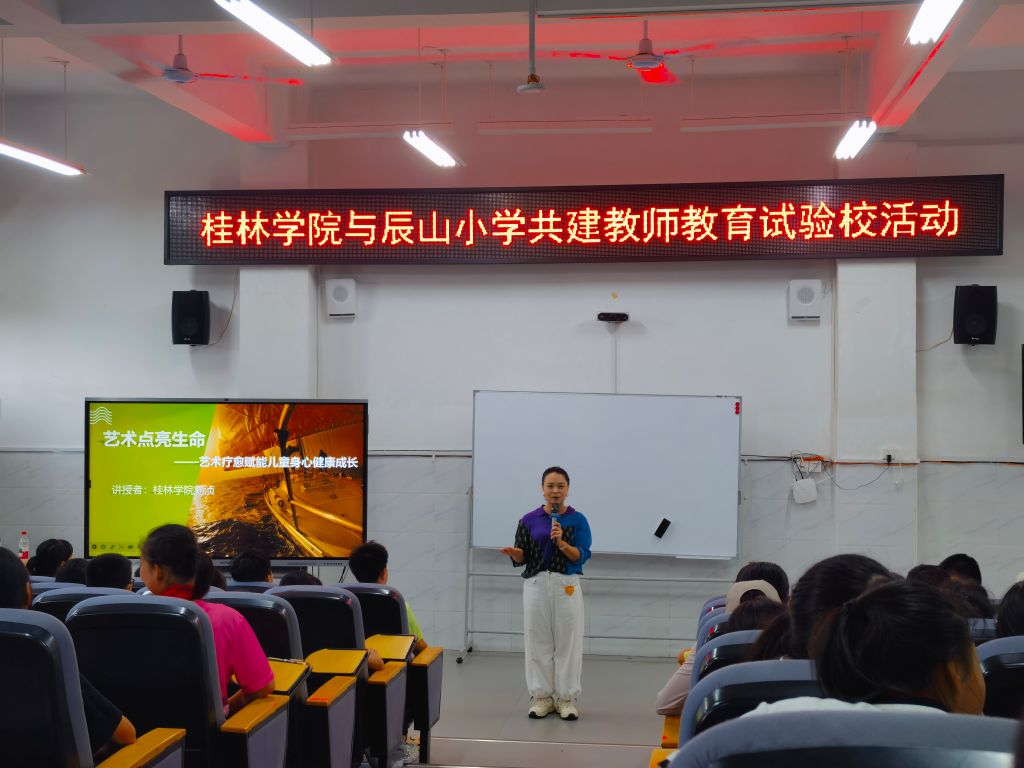 为进一步加强高校与中小学共建,推动基高联动协同发展,6月13日上午,文化与传媒学院教师赴桂林市辰山小学开展教师教育改革创新试验校共建活动,为该校六年级100多名学生精心设计并实施了一场艺术疗愈专题讲座,通过艺术创作引领学生释放压力,表达情感。本次讲座以《艺术点亮生命——艺术疗愈赋能儿童身心健康成长》为题,由汉语言文学专业教师担任主讲,汉语言文学专业负责人一同参加此次讲座。