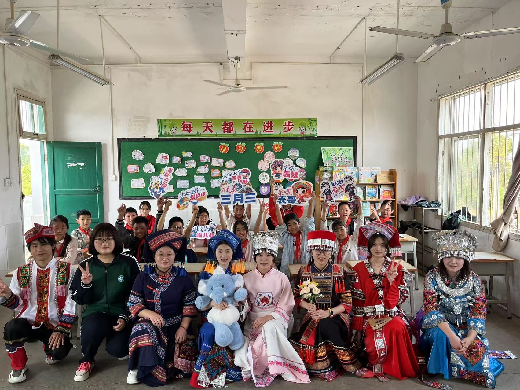 上午 9 时活动拉开序幕。课程师生首先通过 “民族服饰猜猜看”“广西民歌接龙” 等互动游戏,与陶家村小学的同学们一起分享广西民族文化,现场掌声雷动,笑声不断。随后,推广活动按 “故事组”“艺术组”“民俗组” 分组开展:“故事组” 学生用生动的语言,讲述刘三姐以歌传情、瓦氏夫人保家卫国的故事,搭配手绘插画,让孩子们听得入迷;“艺术组” 手把手教孩子们绘制壮锦图案,讲解壮族绣球的象征意义;“民俗组” 则通过图片、短视频和实物(如油茶工具、民族乐器模型),介绍广西各民族的传统节日与生活习俗,引发孩子们阵阵好奇。