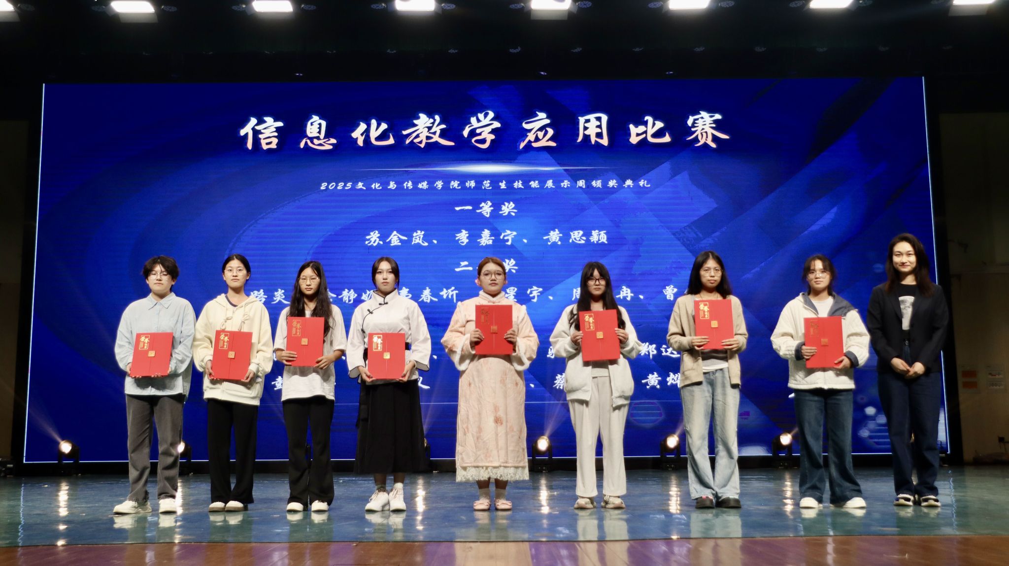 活动现场同步举行了包括师德师风演讲、班主任谈心谈话等师范生系列竞赛的颁奖。同时,学院各教研室本学期课程教学实践相关的微视频创作大赛、中华才艺大赛、传统服饰妆造大赛等多项竞赛的获奖学生还在活动现场登台展示,这些竞赛与课本剧大赛相辅相成,共同围绕 “夯实专业技能、推动实践创新” 的目标,覆盖 “职业素养、教学能力、文化传播” 等关键维度,为学院学生搭建了 “以赛促学、以赛促练” 的成长平台,进一步彰显学院狠抓教学质量、注重实践育人的办学导向。