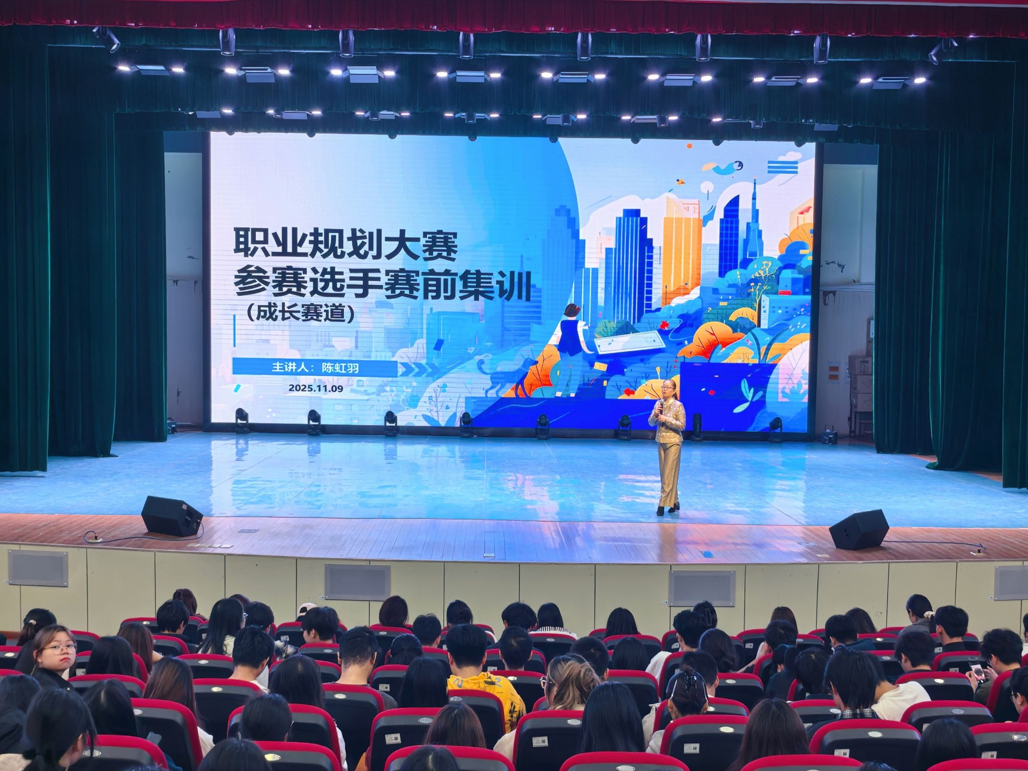 为提升参赛选手综合能力,助力学子科学规划职业发展路径,11月9日晚,文化与传媒学院于弘善讲堂成功举办大学生职业规划大赛成长赛道赛前集训。本次活动特邀陈虹羽老师担任主讲,学院党总支副书记、2024级与2025级辅导员及全体同学共同参与。