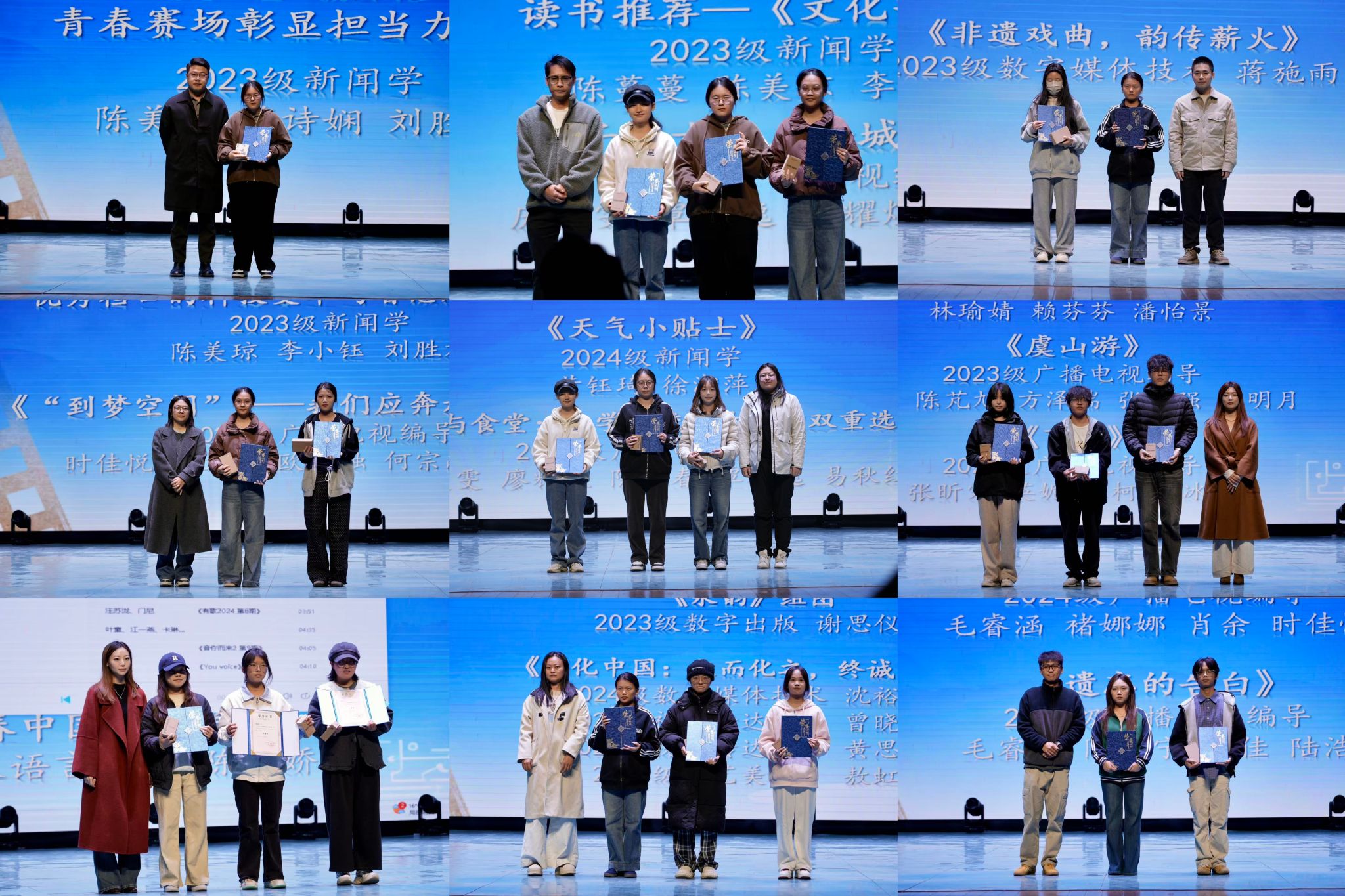 颁奖典礼现场,获奖作品通过动态视频、图文轮播、现场朗读等丰富形式呈现。其中,创意写作类一等奖作品《锦纹里的青春》以创新的“视频书本”形式动态亮相,文字随画面流淌,感染力十足;平面设计类获奖作品则体现了视觉语言与主题内涵的巧妙融合。短视频作品《书籍里的桂林》《匠琴·匠心》《寻真桂粉·韵传天下》聚焦桂林山水人文、非遗技艺与本土风物,以细腻的镜头语言挖掘地域文化内核,用年轻化的表达让桂林故事焕发新的传播活力。
