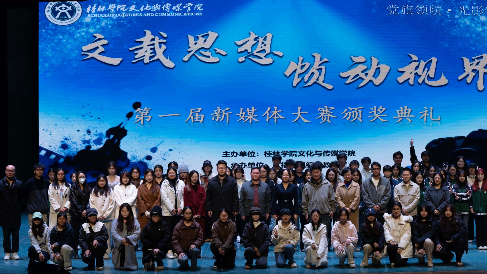 为紧扣新时代人才培养核心要求,深化专业教育与文化育人、思政育人的有机融合,进一步激发青年学子的新媒体创作活力,2025年12 月3日,由桂林学院文化与传媒学院主办、广播电视编导专业承办的第一届新媒体大赛颁奖典礼在弘善讲堂圆满落幕。本次大赛以 “文载思想 帧动视界”为主题,设置新闻短片、剧情短片、短视频、创意写作、平面设计五大参赛类别,吸引全校学子踊跃参与,共征集各类原创作品200余件,经专业评审严格遴选,最终评选出一、二、三等奖共计30项荣誉。获奖作品深度扎根桂林本土文化沃土,运用新媒体技术赋能内容表达,既展现了广大学子扎实的专业素养与创新思维,更传递了青年一代扎根时代、心系家国的责任担当。
