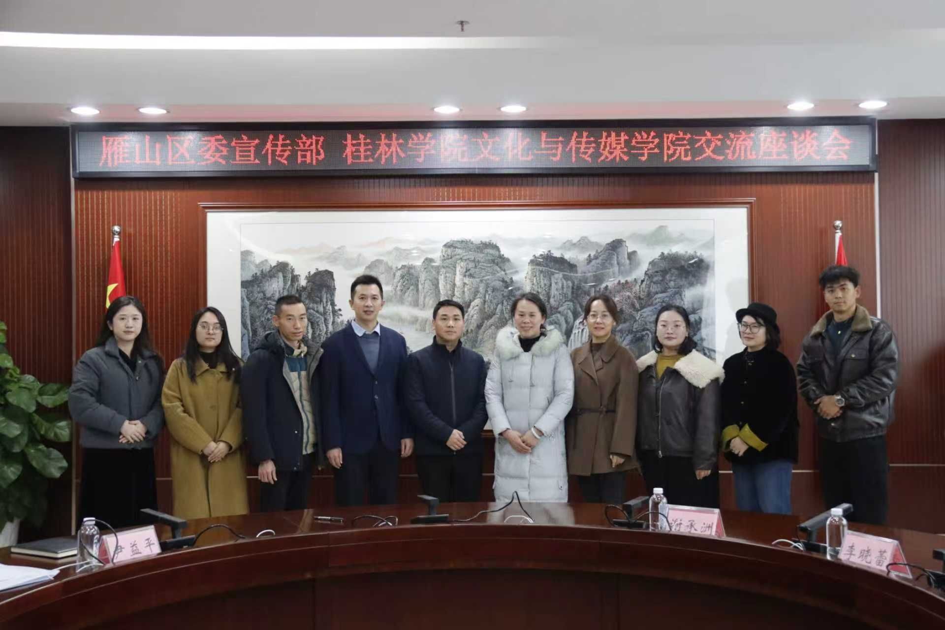 12月24日上午,文化与传媒学院同桂林市雁山区委宣传部共建合作座谈会在雁山区政府顺利举行。文化与传媒学院党总支书记率副院长、副书记以及广播电视编导专业负责人、专任教师代表一行五人前往。雁山区委常委、宣传部部长李伟聪,区委宣传部常务副部长、新闻出版局局长(兼)尹益平,区委宣传部副部长、社科联主席、网信办主任(兼)徐宗飞及宣传部相关人员出席座谈会。