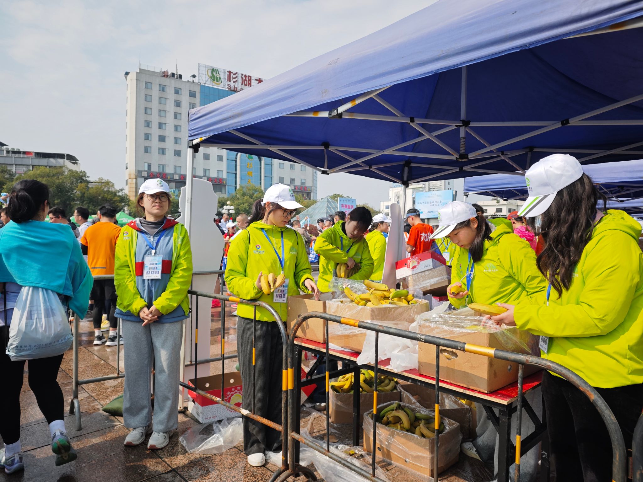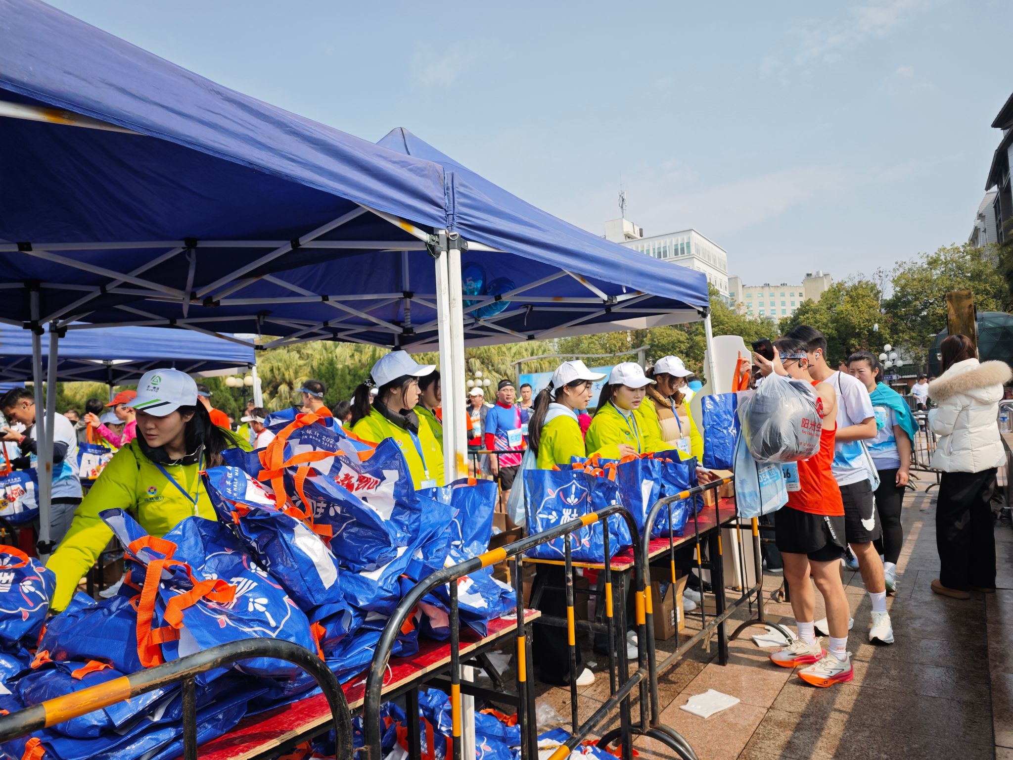 清晨微光中,志愿者们已早早抵达指定岗位,在带队老师的统筹下迅速进入工作状态。半程终点区域人流密集、需求多样,志愿者们分工有序,有的高效分装补给物资,及时为完赛选手递上饮水与食品;有的耐心引导人流,维护现场秩序;还有的主动搀扶体力透支的选手,提供暖心关怀。他们始终以饱满的精神面貌坚守一线,用实际行动诠释了“奉献、友爱、互助、进步”的志愿服务精神。