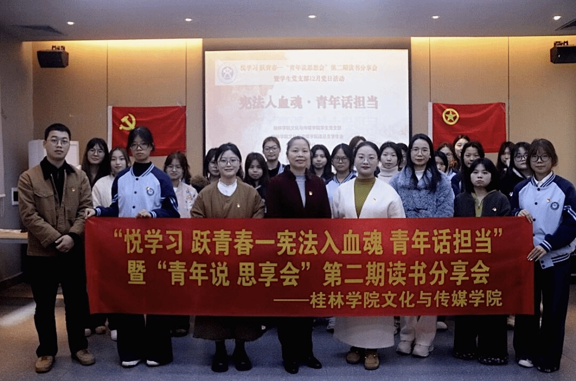 为筑牢青年学子的法治信仰、推动宪法学习走深走实,12月9日,桂林学院文化与传媒学院在党团活动中心成功举办“悦学习 跃青春——宪法入血魂 青年话担当”第二期“青年说·思享会”读书分享会暨学生党支部12月党日活动。桂林学院图书馆馆长、学院党总支书记、党总支副书记、学生社区党支部书记、党总支组织委员、团总支书记、团总支副书记等师生代表齐聚一堂,通过多元形式共学宪法精神,共话青年担当。