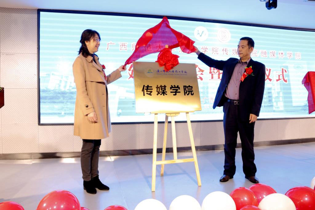 桂林融媒体发展研究会顾问委员会颜星主任(左)与传媒学院/融媒体学院院长王朝元(右)进行揭牌仪式