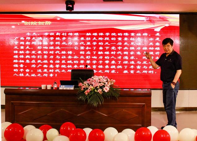 讲座开始,朱剑飞教授展示了创院贺辞,以祝贺我校传媒学院/融媒体学院的成立。他指出,母校新创传媒学院/融媒体学院的隆重挂牌,是广西师范大学漓江学院步入发展壮大阶段的重要标志,亦是中国新闻传播学科成为当代显学的历史见证,其意义重大,影响深远。随后,朱剑飞教授讲述了全国重点高校举办传媒学院的漫长过程及面临问题,并回顾了我校发展历程,他提出要坚持未来发展战略,学院应根据往届毕业生的就业情况,不断调整结构和改进教学模式。在专业期待方面,朱剑飞教授结合中国现代传媒的实际,对传媒的多重属性与教育理念等方面的知识进行了解读,着重为同学们解释基本素养的三大基石、素养教育的八大理念和传媒对社会产生的作用。