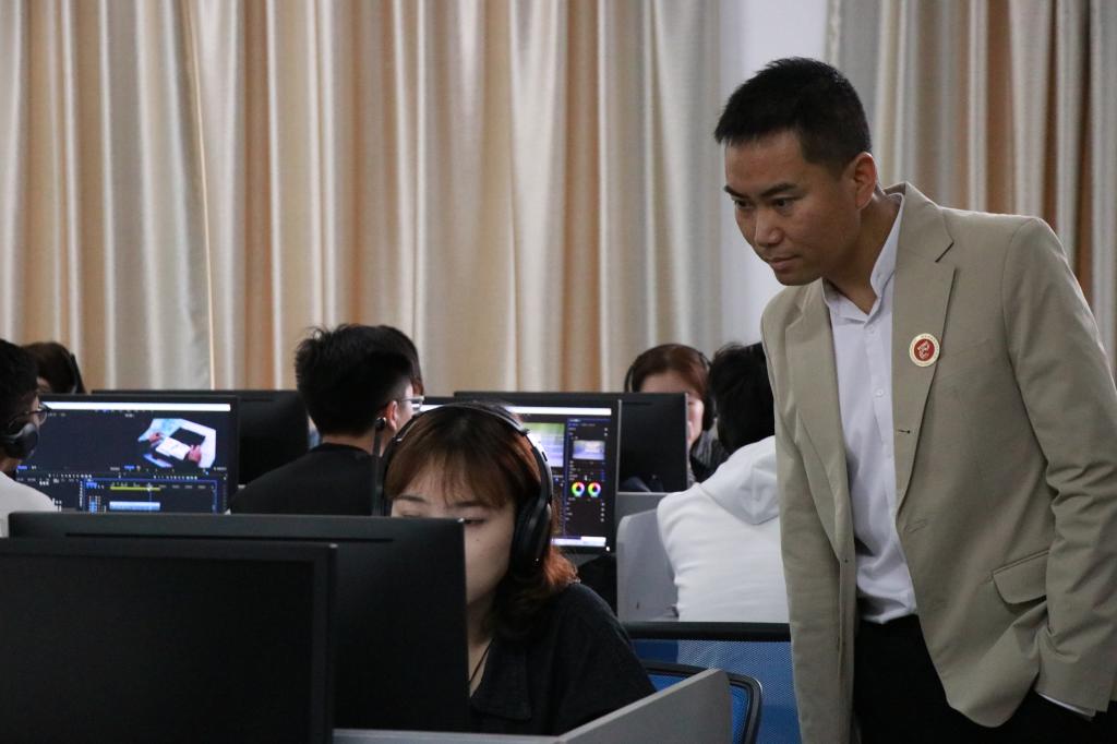 胡又嘉副院长带领研究会会员从至善楼前的大阶梯开始参观。期间经过了乐善食府、育善林以及新近建设的独秀书房等标志性建筑物。在传媒学院教学楼,研究会会员在胡又嘉副院长的介绍下,详细阅览了传媒学院的宣传海报和教师简介,以及传媒学院的教学理念、师资力量等。最后,研究会会员参观到嘉善楼三楼的实训基地,近距离接触了各实训基地以及新添专业设备,同时也参观了播音录制现场、非线性编辑的实践教学课程。