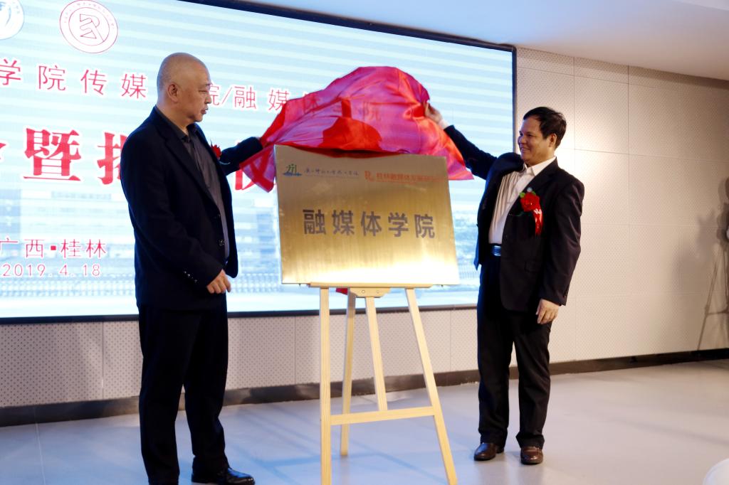 桂林融媒体发展研究会顾问委员会颜星主任(左)与传媒学院(融媒体学院)王朝元(右)进行揭牌仪式