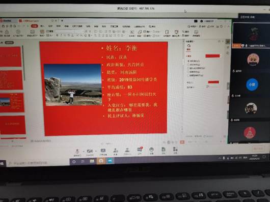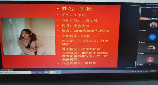 为向党组织推荐优秀团员作为党的发展对象,充实党的新生力量。4月20日晚,2019级新闻传播学类团支部在团支书孙丽雯和各班干的带领下,通过线上会议的形式开展本年度的入党推优工作。