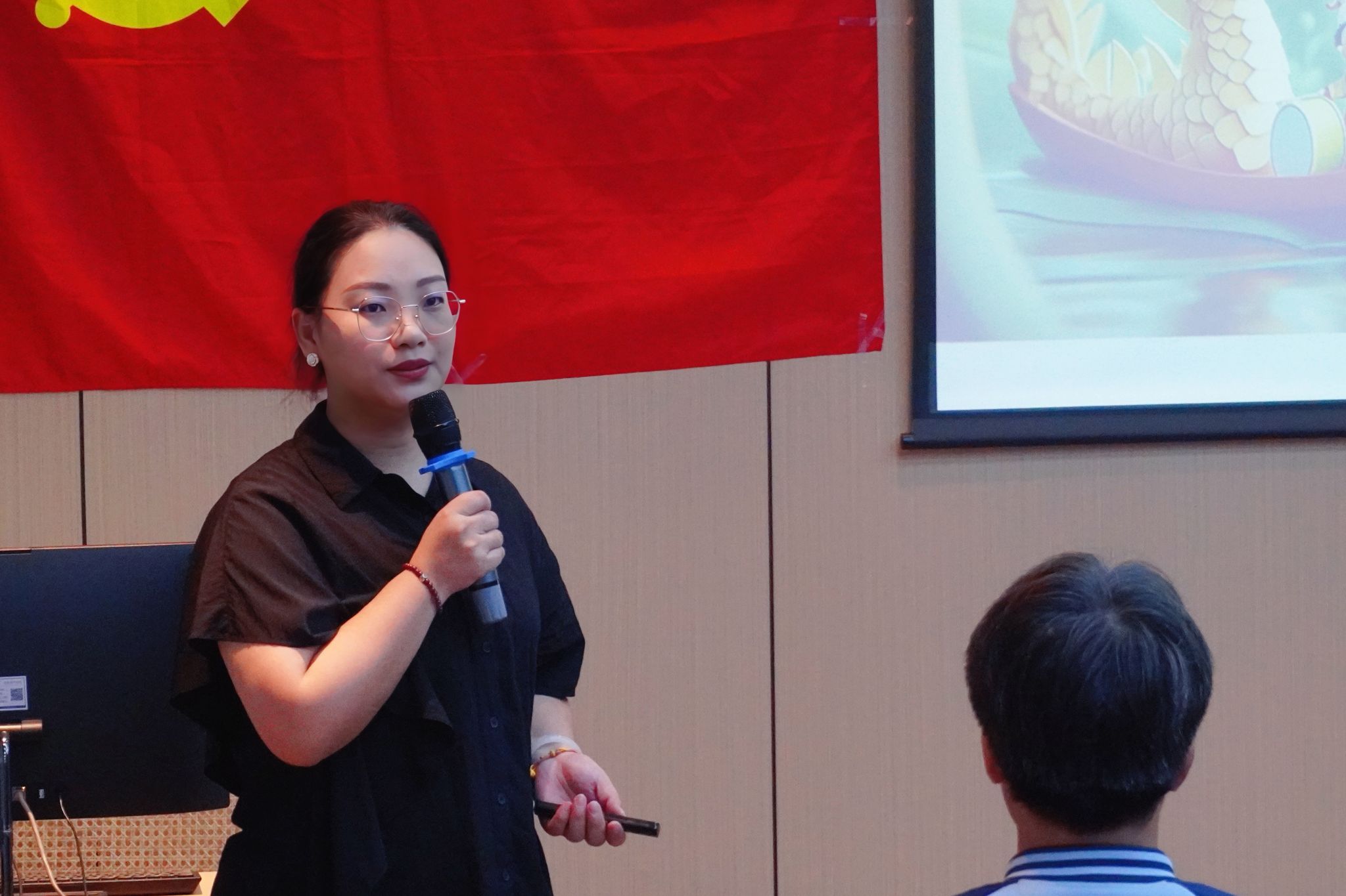 活动伊始,党总支副书记“以共有文化符号铸牢民族团结”为题展开理论讲解。她指出,共有文化符号是民族文化的载体,也是民族团结的情感纽带,有助于凝聚共同目标、增进民族认同。她强调,端午节正是共有文化符号的生动体现,在推动中华民族共同体意识从符号象征转化为情感认同中发挥着重要作用。随后,主讲人围绕语言、节庆与服饰三个领域,具体阐述了共有文化符号的应用与推广路径。她提出,要充分发挥语言在民族团结中的桥梁作用,强化节庆活动对民族情感的促进作用,并重视传统服饰在民族交流中的文化表达功能。
