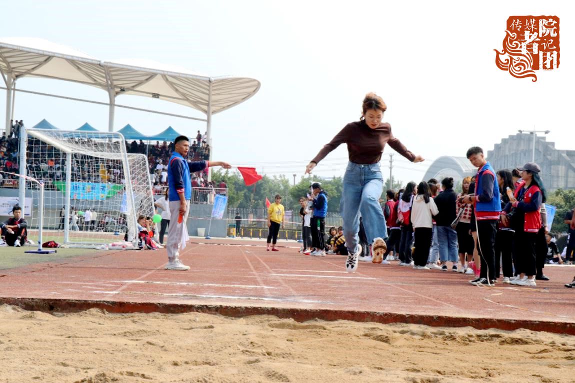 2019级广播电视编导专业学生高慧取得了7.45米的成绩。只见她在开始前就活动身体,裁判员说道:“预备:跑。”只见她弓着腰,双手紧握拳头,两眼盯着前方,然后猛一甩头,迈开大步,一支箭似的走飞的狂跑,速度越来越快,猛地一跃,两腿向前开展,在空中划出一道弧线,然后落在松软的沙子上。