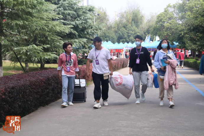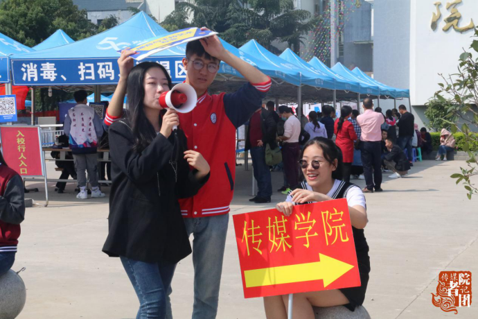 “走过路过不要错过,传媒学院在这里……”牵引组的同学们在校门口用小喇叭喊话吸引新生注意