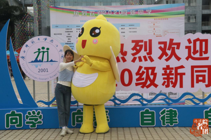 2020级新闻传播学专业的新生柳叶青同学与社团宝贝合影留念