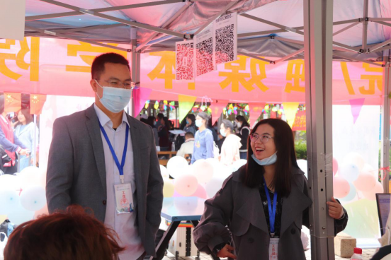 传媒学院副院长胡又嘉在和传媒学院党总支副书记王德彬谈论新生报到情况。