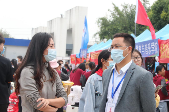 我院党总支副书记王德彬在和新生辅导员曹依婷了解新生报到情况。