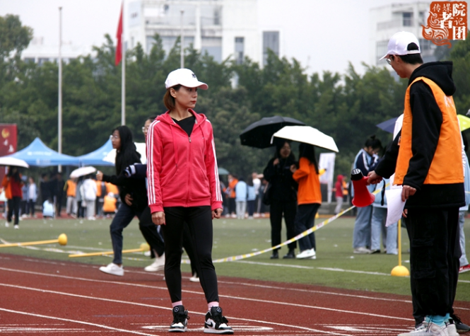 即使天空飘着小雨,也淋不灭师生的激情,操场上依旧人声鼎沸,加油的声音此起彼伏。比赛开始之前,郭彬彬老师与旁边的老师展开交流,分享经验,同时也放松自己的身心,为比赛做好准备。