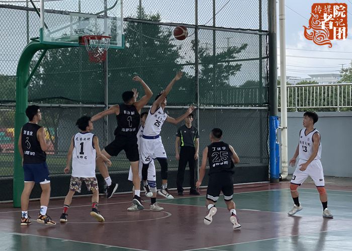 随着裁判员的一声哨响,比赛正式开始。双方主攻球员奋起抢球展开激烈竞争。经管学院男篮在第一场比拼中配合明显更加默契有序,并在罚球时刻拿下本场首分,而传媒学院男篮此刻还没进入状态。上半场比赛结束,双方球队利用短暂的休息时间展开讨论,调整作战策略。比赛继续,双方球员重整旗鼓继续投入赛场,传媒学院斗志十足,主攻队员韩舒桐展臂抢球,在与队友默契配合中灵活走位,躲闪拦截,跳起上篮,接连拿下比分,最终传媒学院以29:28赢得上半场比赛。