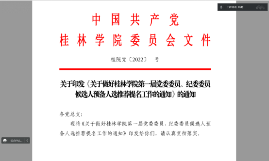 会上,党总支孙俊书记宣读了《关于做好中国共产党桂林学院第一次代表大会代表选举工作的通知》(桂院党【2022】号)和《关于做好桂林学院第一届党委委员、纪委委员候选人预备人选推荐提名工作的通知》(桂院党【2022】号),向各位党员教师详细介绍了文件的主要内容、具体要求和推荐条件。孙书记充分说明了此次大会的重要意义,是桂林学院政治生活中的一件大事,选举好党代表,推荐好党委委员、纪委委员候选人是开好会议的基础。传媒与新闻学院党总支一定要把这项工作列入重要工作日程,切实加强领导。要充分发扬党内民主,认真贯彻执行民主集中制原则,尊重党员的民主权利。要严格按照规定和程序,切实保证选举、推荐质量,各种表格填写要准确完整、符合要求、按时上报,确保中国共产党桂林学院第一次代表大会选举、推荐工作任务圆满完成。