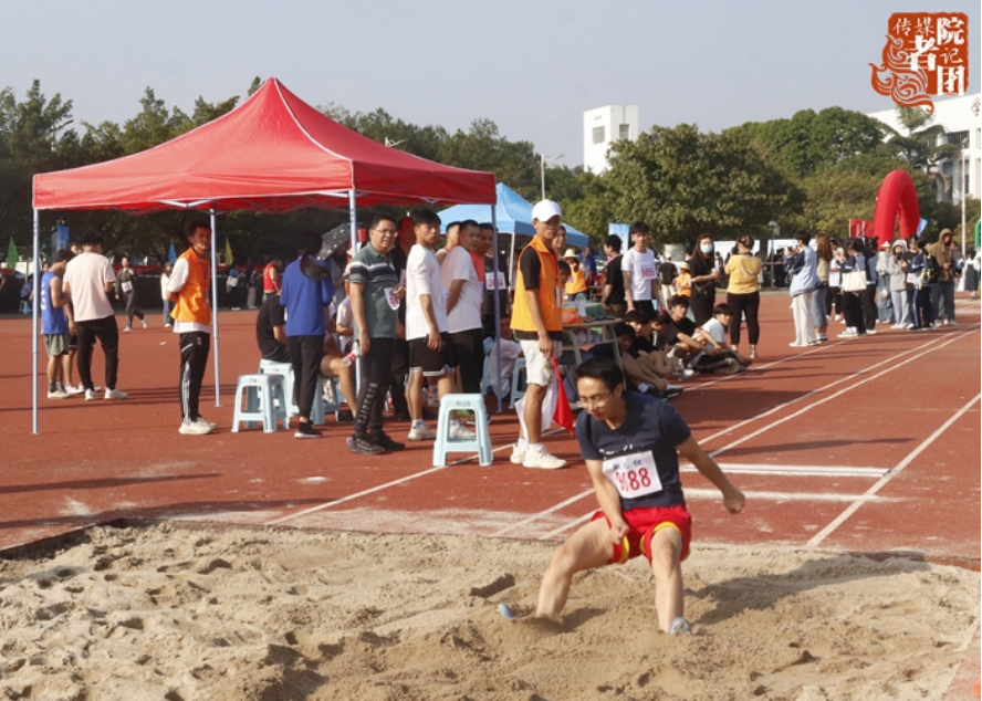 11月11日上午,男子教工甲组跳远决赛在田径场观众热烈的欢呼声中结束。来自传媒与新闻学院的谭子龙老师以5.14米的佳绩斩获桂冠!