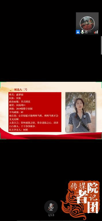 4月7日晚,传媒学院2019级数字出版团支部响应党的号召,发扬党的精神,于线上开展了入党推优活动。本次会议由团支部书记惠梦园主持,传媒学院团总支书记周俊巧、学生党员黄晨及全体数字出版团支部成员参加了此次活动。