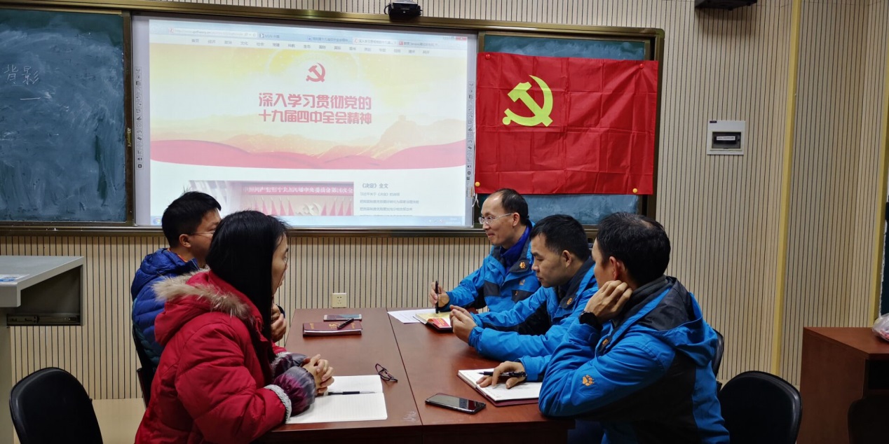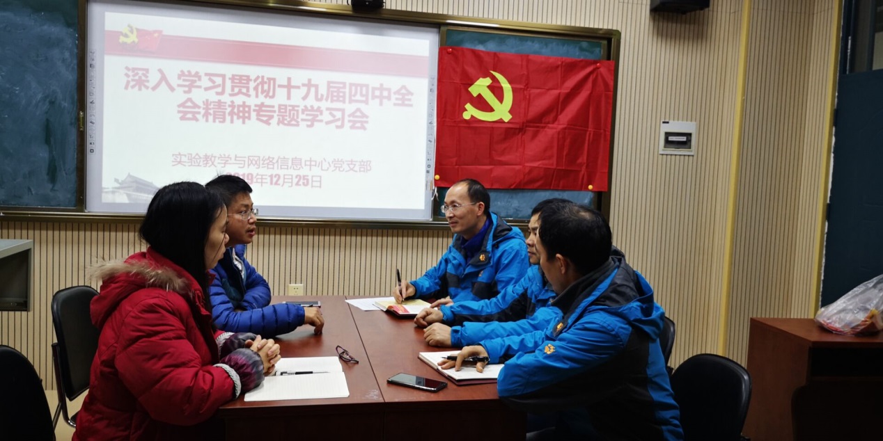 12月25日下午,实验教学与网络信息中心党支部召开会议专题学习十九届四中全会精神。在此之前,已经组织党员同志利用电视、报刊、网络收听收看有关新闻报道。本次举行专题学习会,结合主题教育和学校工作实际展开讨论交流。大家纷纷表示,一定要学深悟透全会精神,把思想和行动统一到全会精神上来,推动全会精神落到实处、取得实效。支部书记代国勇在学习会上表示,学习贯彻十九届四中全会精神要与“不忘初心、牢记使命”主题教育紧密结合起来,牢记立德树人的根本任务。同时,全面深入学习社会主义核心价值观,提高思想意识。