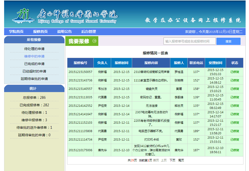 网上报修系统自今年10月正式上线运行后便受到了学院教职工的热切关注。在过去的两个月里,通过网上报修系统,我们共接到286份设备报修单,其中教学设备报修163单,办公设备报修123单。秉着为学院师生服务的理念,部门10月、11月的报修完成率达到100%,今后部门上下仍会继续努力,把维修维护工作做到更好。