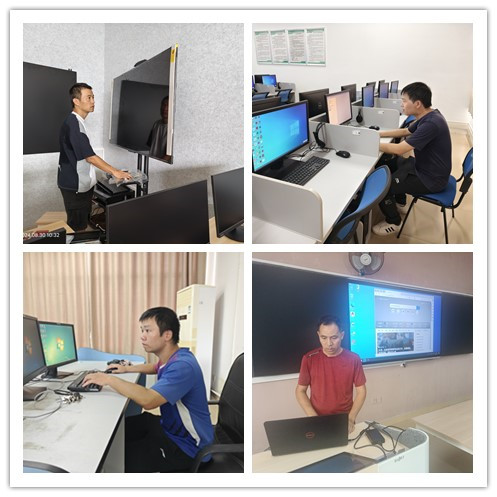 设备管理员、实训专员穿梭于各教学楼,逐间排查实验实训室、多媒体教室的设施设备情况,对计算机、投影机、幕布、音响、话筒等教学设备逐一开机检查,优化计算机系统及软件,发现的故障问题及时解决,保障设备正常运行。