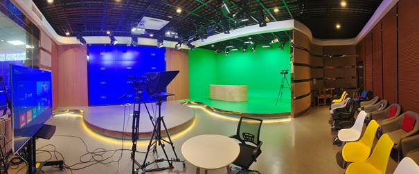 电视演播室总面积达100平方,可容纳40人,双向透视玻璃把实训室分隔成前录、后演开放式两部分,演播室与导播间相互独立,授课教师可以在不受外部影响的情况下开展教学活动,听课教师在导播间通过双向玻璃和实时录像关注教学全过程,使上课、听课、评课可以同步进行,提升了听评课的效率。演播室的投入使用,增强了学校教师使用信息化教学手段的能力,极大地提升了师生参加教学能力大赛的积极性,更好地适应高校在线精品课程建设的需求,进一步提高了学校办学质量。