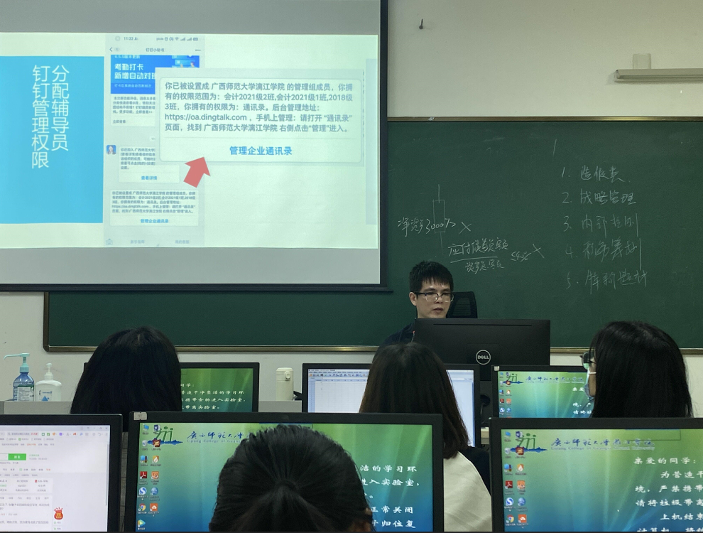 为推进学校创建“广西绿色学校”工作,加深加强学校钉钉平台的应用,提升学生管理效能,5月17日下午,实验教学与网络信息中心联合学生事务部在至善楼3407机房举行校园智能化管理培训会,中心王健老师应邀为全体辅导员作培训。