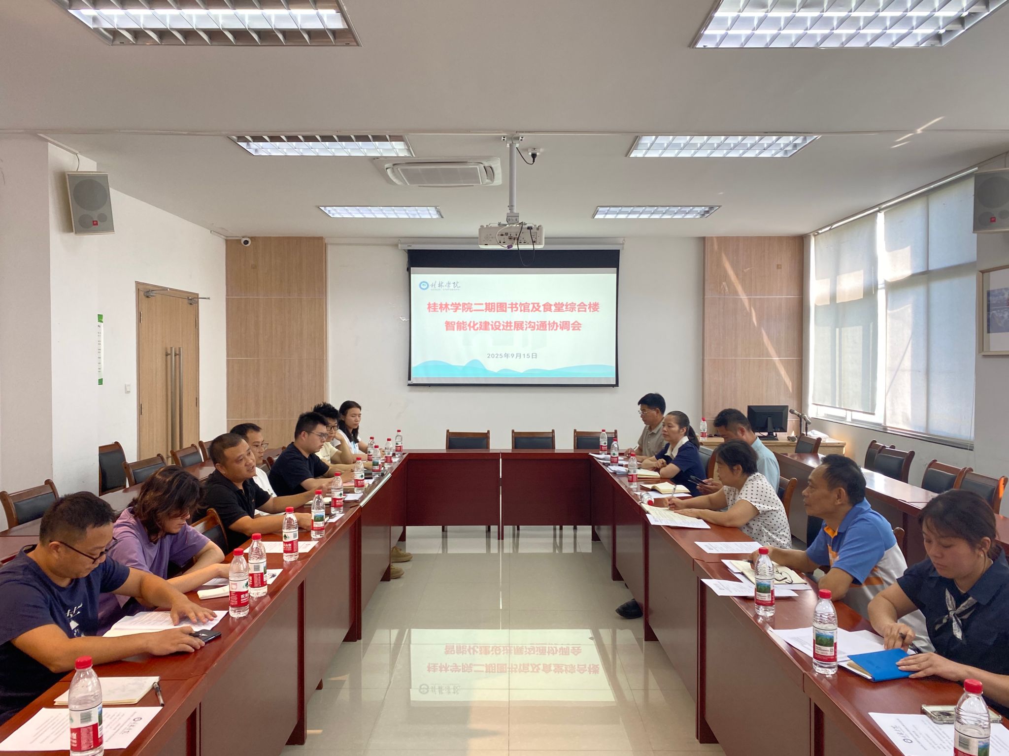 会上,二期工程设计院负责人、二期工程项目部负责人、桂林中海基建投资有限公司负责人分别从工程进度、供货保障、质量管控等方面汇报了二期图书馆及食堂综合楼智能化建设进展情况。当前项目整体进度良好,节点目标明确,正全力冲刺项目“收官战”。