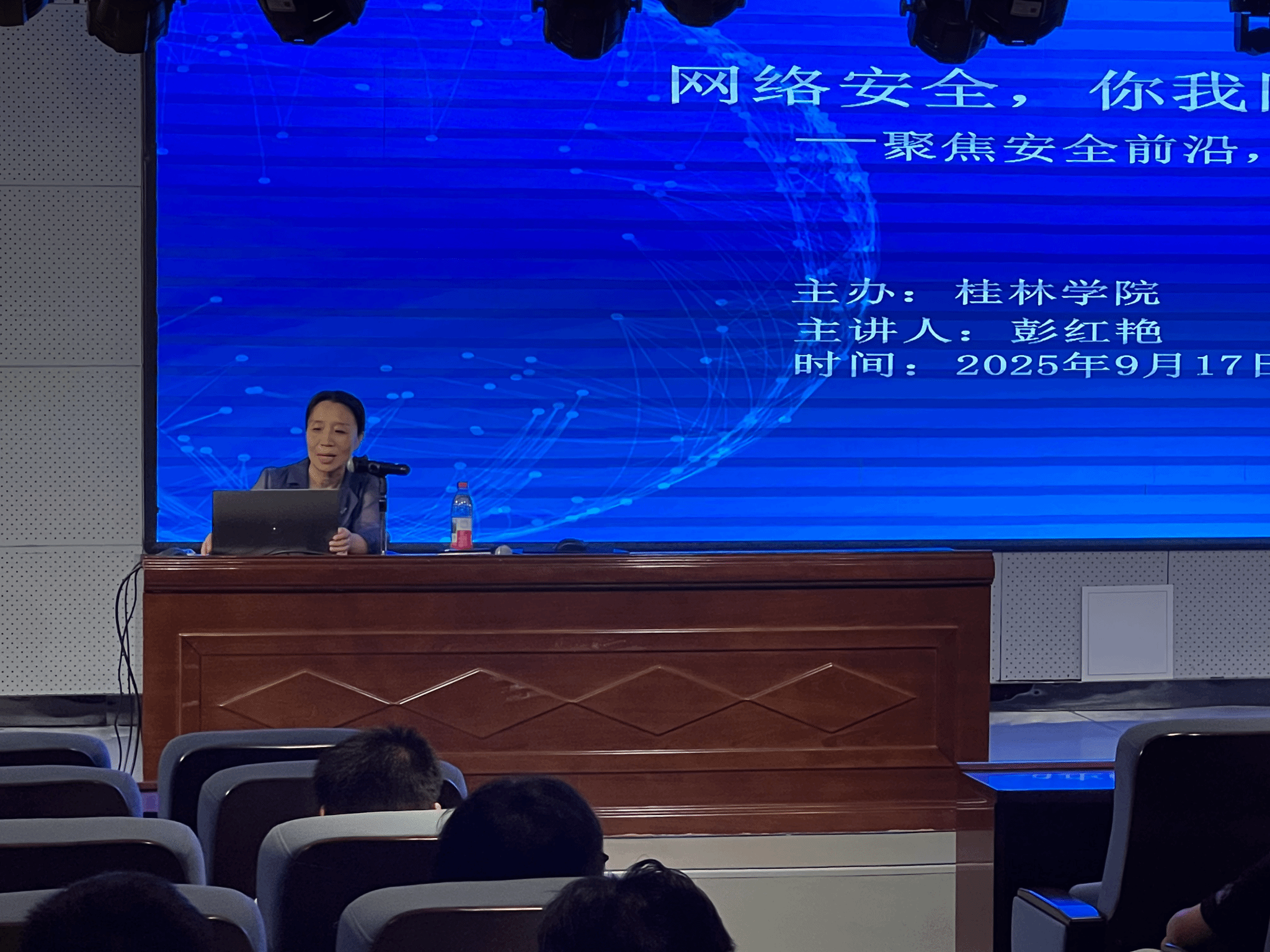 为积极响应国家网络安全宣传号召,提升全校师生的网络安全意识和防护技能,营造安全、健康、文明的校园网络环境,9月17日下午,学校特邀广西师范大学计算机科学与工程学院彭红艳副教授,在至善讲堂成功举办“网络安全,你我同行—聚焦安全前沿,筑牢防范根基”的2025年网络安全宣传周专题讲座。讲座由网络与信息化处处长主持,来自各二级学院的150名学生代表参加此次讲座。