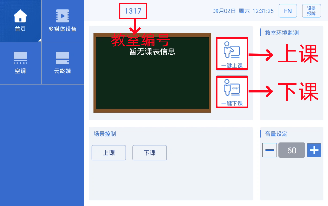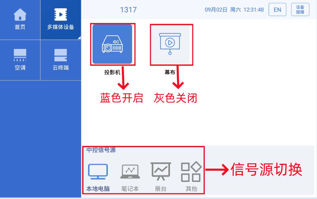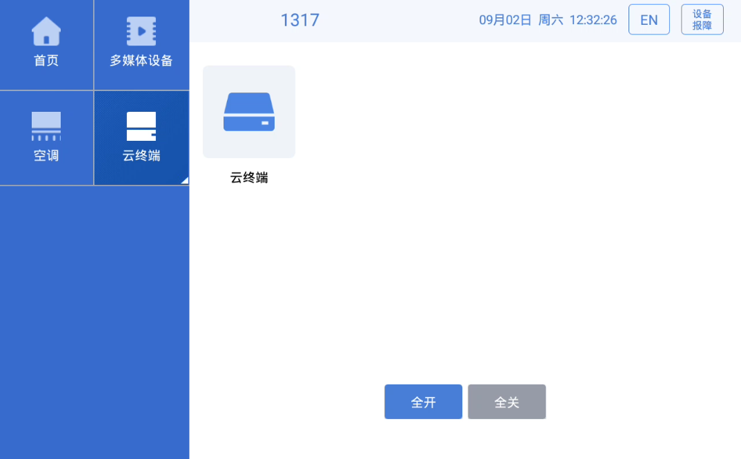 首页设备目录:1.多媒体设备(投影机、幕布)、2.空调(电视)、 3.云终端(电脑)、4.灯光